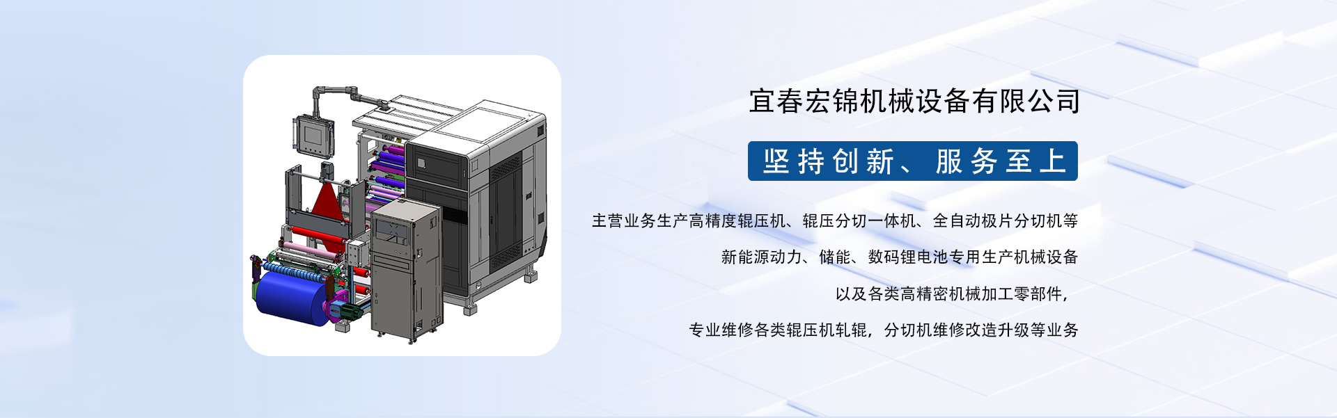 東莞市宏錦機(jī)械科技有限公司江西分公司是一家集研發(fā)、生產(chǎn)、銷售、服務(wù)于一體的創(chuàng)新型鋰電自動(dòng)化精密機(jī)械設(shè)備專業(yè)制造、服務(wù)商,坐落于江西省新余市渝水區(qū)新余經(jīng)濟(jì)開發(fā)區(qū)孵化園5號(hào)廠房,廠房面積近6000平米,由東莞市宏錦機(jī)械科技有限公司于2024年11月投資新建,交通區(qū)位優(yōu)勢(shì)明顯、產(chǎn)業(yè)配套便捷集中,擁有一批具有行業(yè)豐富經(jīng)驗(yàn)的技術(shù)人員和管理團(tuán)隊(duì)。公司主營(yíng)業(yè)務(wù)生產(chǎn)高精度輥壓機(jī)、輥壓分切一體機(jī)、全自動(dòng)極片分切機(jī)等新能源動(dòng)力、儲(chǔ)能、數(shù)碼鋰電池專用生產(chǎn)機(jī)械設(shè)備以及各類高精密機(jī)械加工零部件,專業(yè)維修各類輥壓機(jī)軋輥,分切機(jī)維修改造升級(jí)等業(yè)務(wù)。根據(jù)公司發(fā)展三步走戰(zhàn)略規(guī)劃經(jīng)營(yíng)現(xiàn)下設(shè)三個(gè)二級(jí)獨(dú)立運(yùn)營(yíng)事業(yè)部分別為分切事業(yè)部(分切機(jī)、輥壓分切一體機(jī))、磨輥事業(yè)部(輥壓機(jī)、軋輥修磨)、機(jī)加事業(yè)部(精密機(jī)械部件加工)。經(jīng)過(guò)十余年沉淀發(fā)展主要客戶有新余贛鋒、南昌維科、宜春清陶、云南路華、河南恒一、江西程疆、四川天萊、蕪湖天弋、惠州億緯鋰能、無(wú)錫盤古新能源、鄭州比克、安徽鋰天下、臺(tái)灣長(zhǎng)利(宏基集團(tuán))、重慶維都利(紫建電子)、贛州諾威、安徽利維能、漳州萬(wàn)寶、重慶佳寶成、廣西皇冠儲(chǔ)能等一批具有行業(yè)知名度和影響力的企業(yè)。公司在新能源發(fā)展的道路上堅(jiān)持創(chuàng)新,為客戶帶來(lái)穩(wěn)定、高效的自動(dòng)化專用設(shè)備和更大的收益。